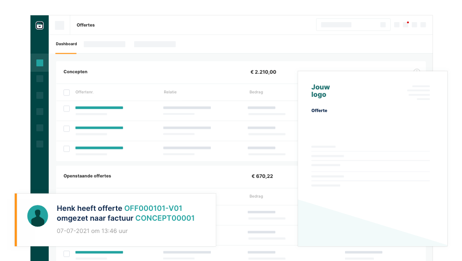 Professionele offertes maken waarbij je gebruik maakt van één of meerdere huisstijlen. Laat je klant de offerte eenvoudig online accepteren. Nog even een aanpassing? Maak van je offerte een nieuwe versie zonder de eerste kwijt te raken! Beperk fouten, bespaar tijd én krijg inzicht in je verkoop.