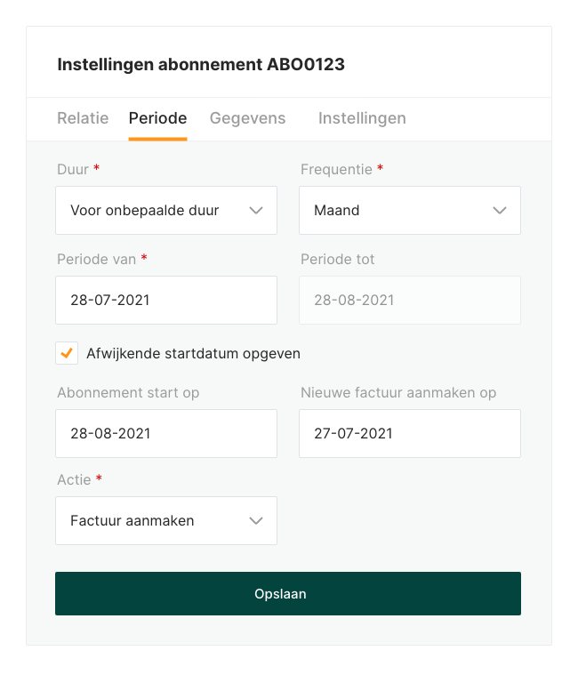 Jij hanteert voor je abonnementen standaard een start van de eerste tot de eerste van de maand. Maar nu moet je abonnement gefactureerd worden vanaf de 15e van die maand. Geen probleem! Je periode is bijvoorbeeld 01-06-2020 tot 01-07-2020 maar het abonnement gaat in op 15-06-2020. Je geeft dan bij het aanmaken van je abonnement een afwijkende startdatum op. De eerste periode wordt nu 15-06-2020 tot 01-07-2020 en de nieuwe periode is 01-07-2020 tot 01-08-2020. Je klant krijgt ook de rekening vanaf 15-06-2020 en die kosten worden automatisch berekend.