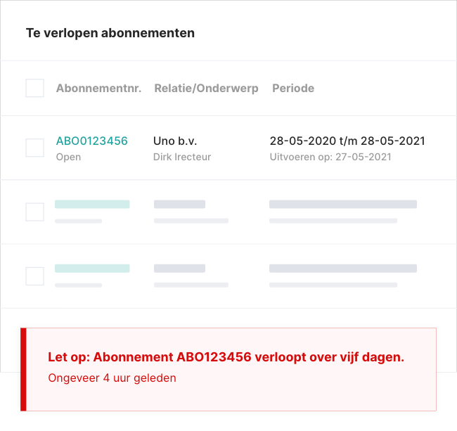 Je kunt een einddatum instellen op een abonnement. Het kan dan handig zijn dat jij weet wanneer dit abonnement gaat verlopen. De abonnementen die gaan verlopen kun je terugvinden op je dashboard, maar je kunt ook meldingen instellen die een aantal dagen van te voren worden verstuurd naar de medewerker die jij selecteert.