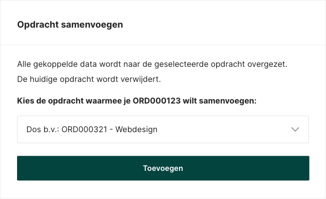 Je kunt een opdracht samenvoegen met een andere opdracht, je budget, uren en kosten worden dan samengevoegd met de opdracht die je selecteert.