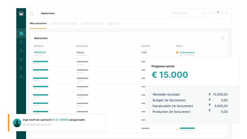 Opdrachten beheren vanuit een vastgesteld budget of werk op nacalculatie. De geregistreerde uren vind je terug op de opdracht en zo creëer je inzicht. Daarnaast boek je kosten op de opdracht die je door kunt facturen en beheer je de status van je opdracht in een handomdraai.