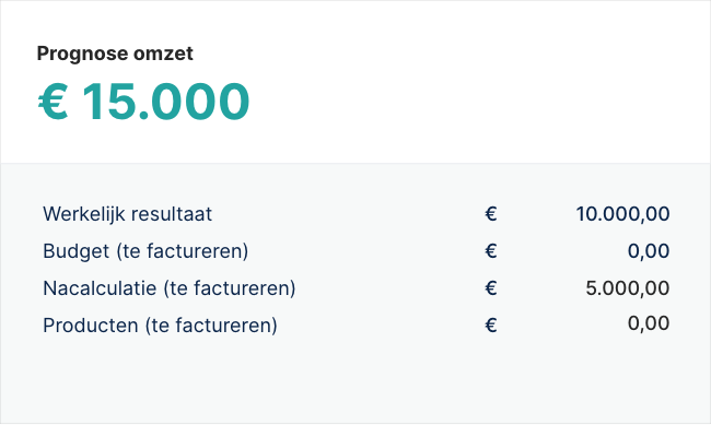 Of je nu met opdrachten op nacalculatie werkt of met een budget, je creëert inzicht in je besteding van uren en kosten op de opdracht per medewerker. Je ziet actuele informatie zoals geboekte uren, gefactureerde uren, onverwerkte uren, afgeboekte uren, omzet van producten, het resultaat van je opdracht en de prognose van de omzet als je opdracht nog loopt. Per medewerker zie je de uren, omschrijving en besteding van de tijd.