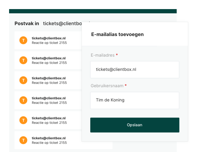 Bij het instellen van een ticket e-mailadres kun je ervoor kiezen om te werken met een e-mailalias. Hiermee zorg je ervoor dat e-mails doorgestuurd worden naar Clientbox. Je kunt er ook voor kiezen om een fysieke inbox te koppelen. De mails die daarop binnenkomen worden dan automatisch opgehaald in Clientbox en verwijderd uit je fysieke inbox. Het voordeel hiervan is dat je e-mails die je naar een fysieke inbox sleept alsnog in Clientbox komen.