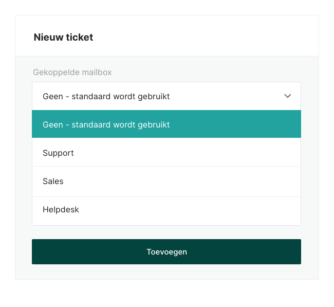 Je kunt werken met verschillende e-mailadressen. Gebruik jij bijvoorbeeld support@ en sales@, dan stel je deze los van elkaar in. Wanneer een klant een e-mail richt aan support@ wordt dit e-mailadres als afzender gebruikt, maar kun je deze wijzigen naar een andere inbox. Deze afzender kies je per ticket, ook bij een ticket dat je handmatig aanmaakt.