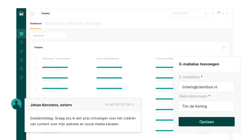 Hou met het ticketsysteem controle en inzicht op alle (aan)vragen die binnenkomen in één of meerdere inboxen. Jij en je teamleden kunnen vragen beantwoorden, bijlagen toevoegen, offertes maken, snippets gebruiken en tickets aan iemand anders toewijzen. Bovendien linkt Clientbox een ticket automatisch aan het bedrijf of de persoon in de module CRM.