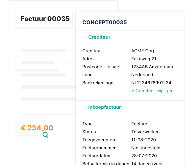 Laat de scan & herken functionaliteit automatisch je leverancier, factuurnummer, factuurdatum, de btw en de bedragen herkennen. Hierdoor hoef jij alleen nog een controle te doen op de ingevulde gegevens en zet je een inkoopfactuur met één klik door naar je administratie.